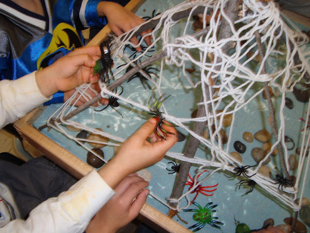 Children engaging in rich, imaginative, cooperative dramatic play and oral language with one another as they 'spin' their spiders' adventures...